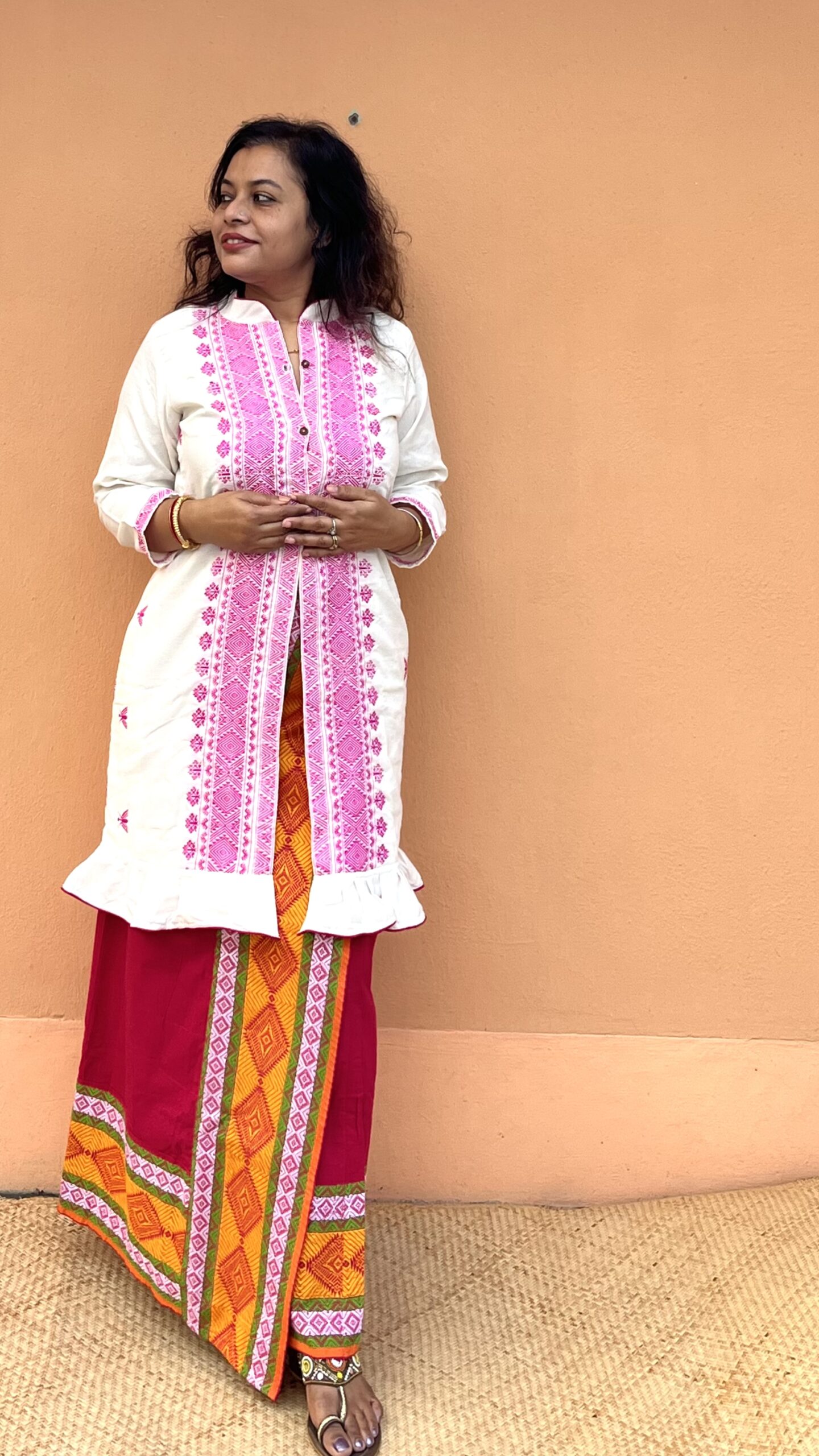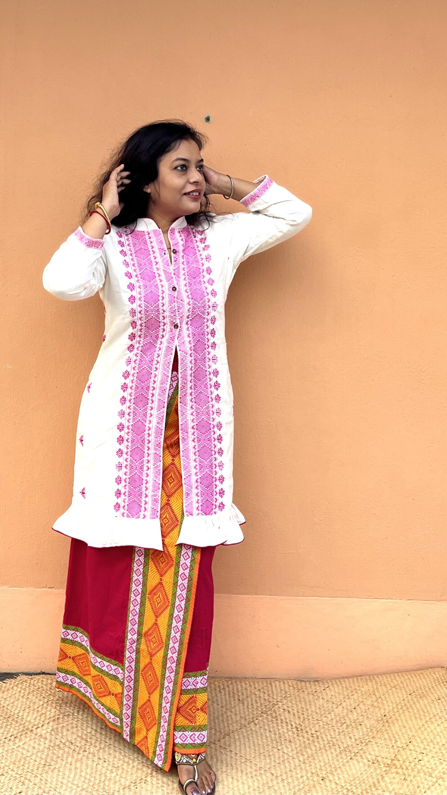 Presenting this set of dokhona wrapped skirt teamed up with karbi fabric jacket.