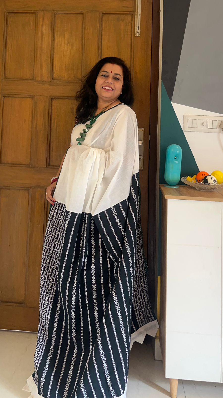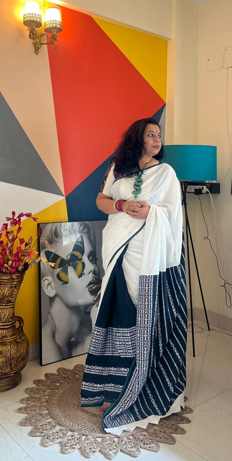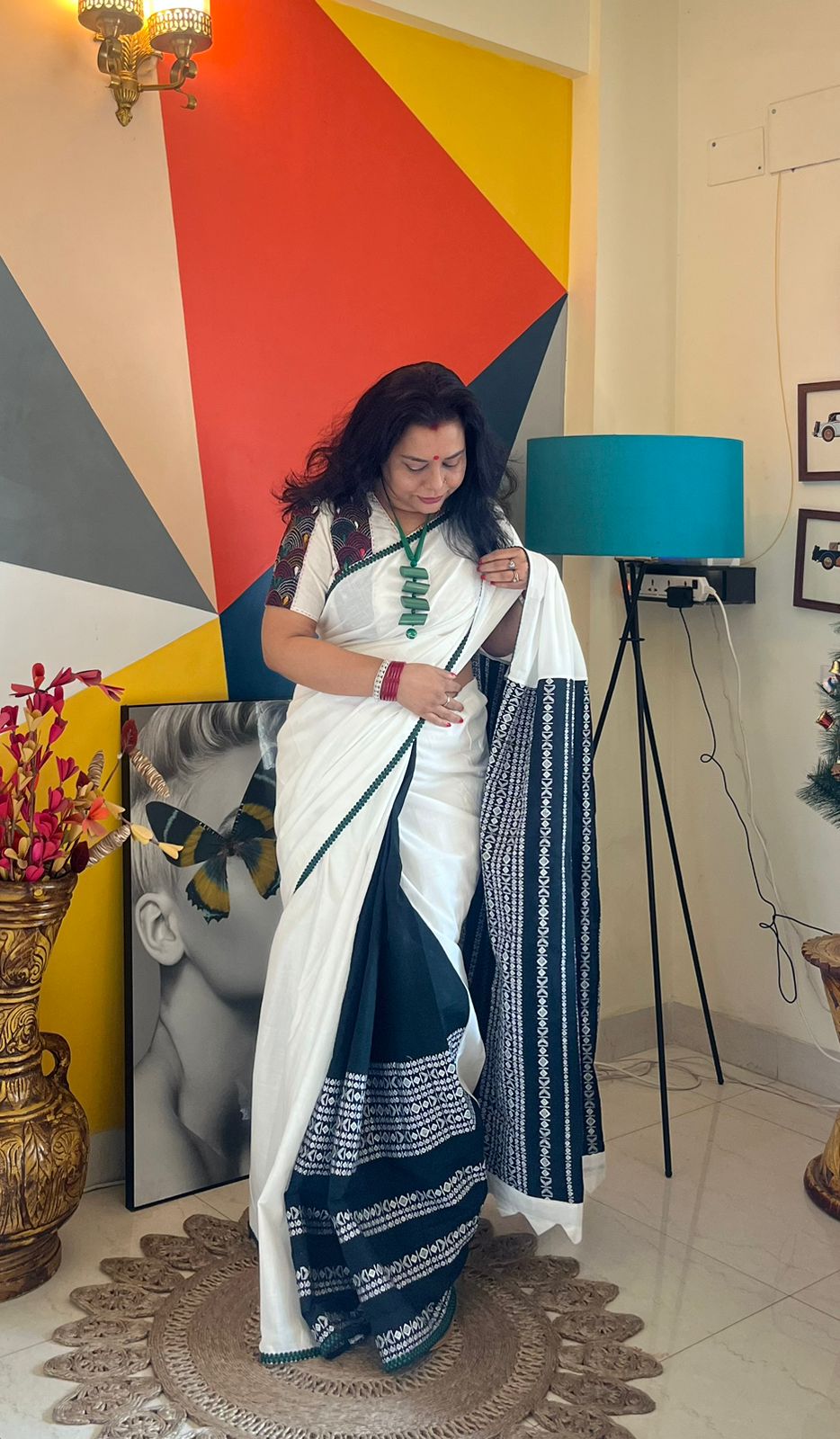 This saree is created with handloom tribal fabric in green and white slub cotton fabric.