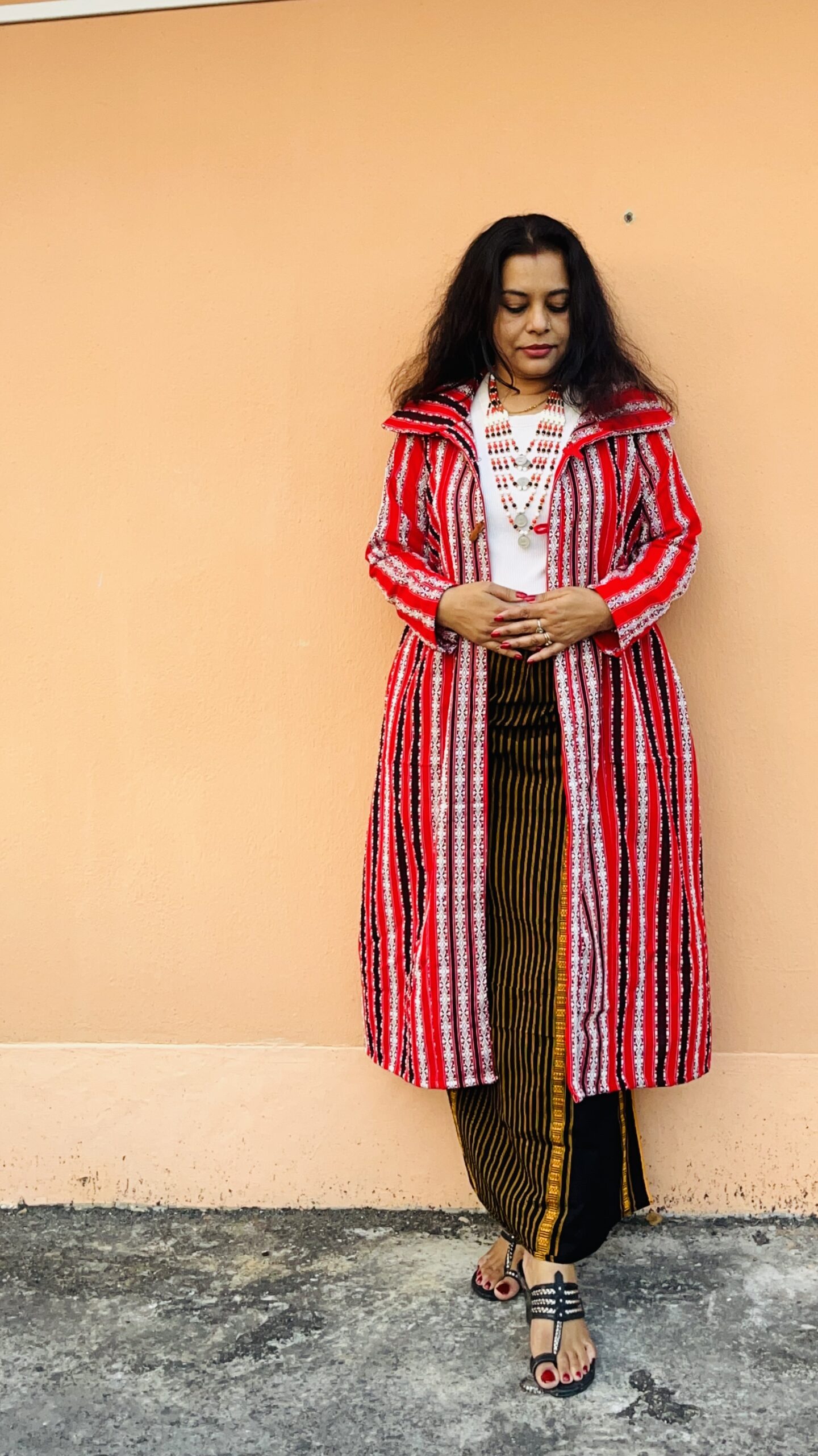 Tribal fabric long shrug with collar and pockets .