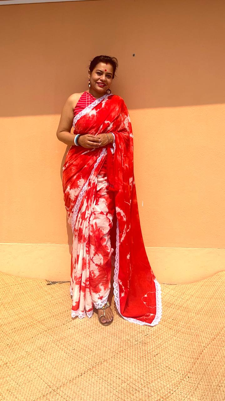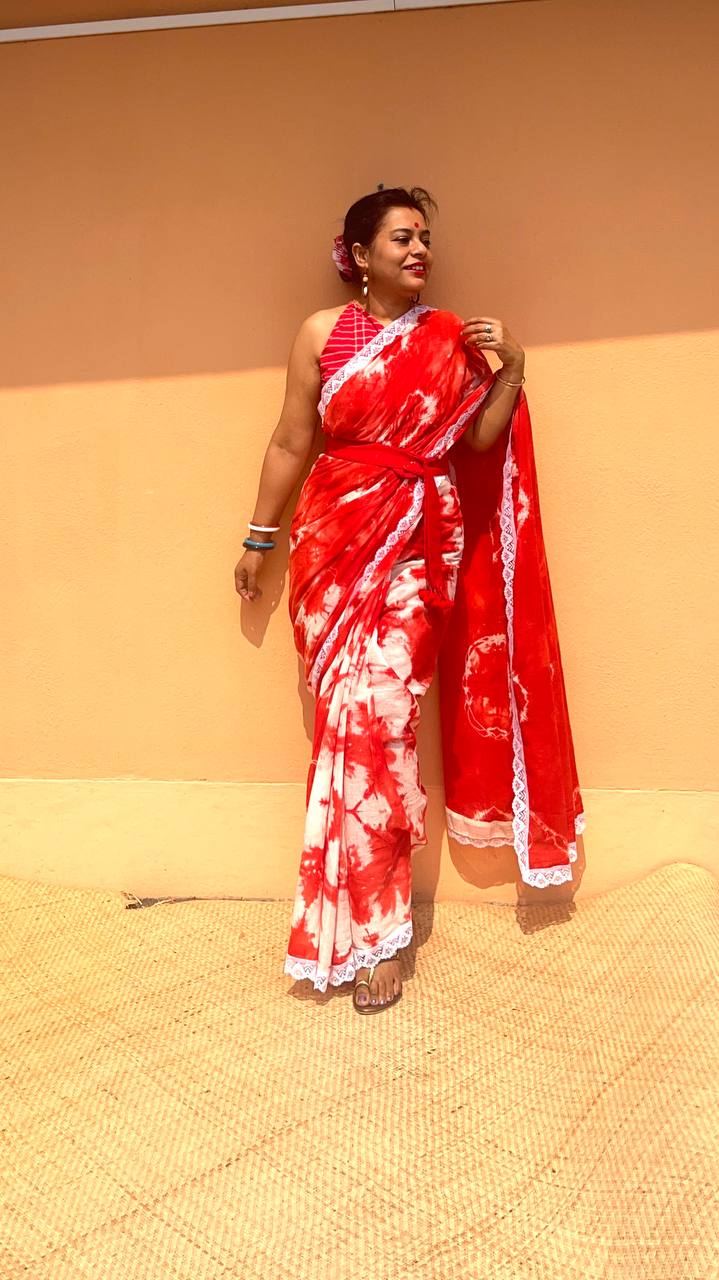 Tye-n-Dye Mulmul Saree with Lace Border in Red colour.