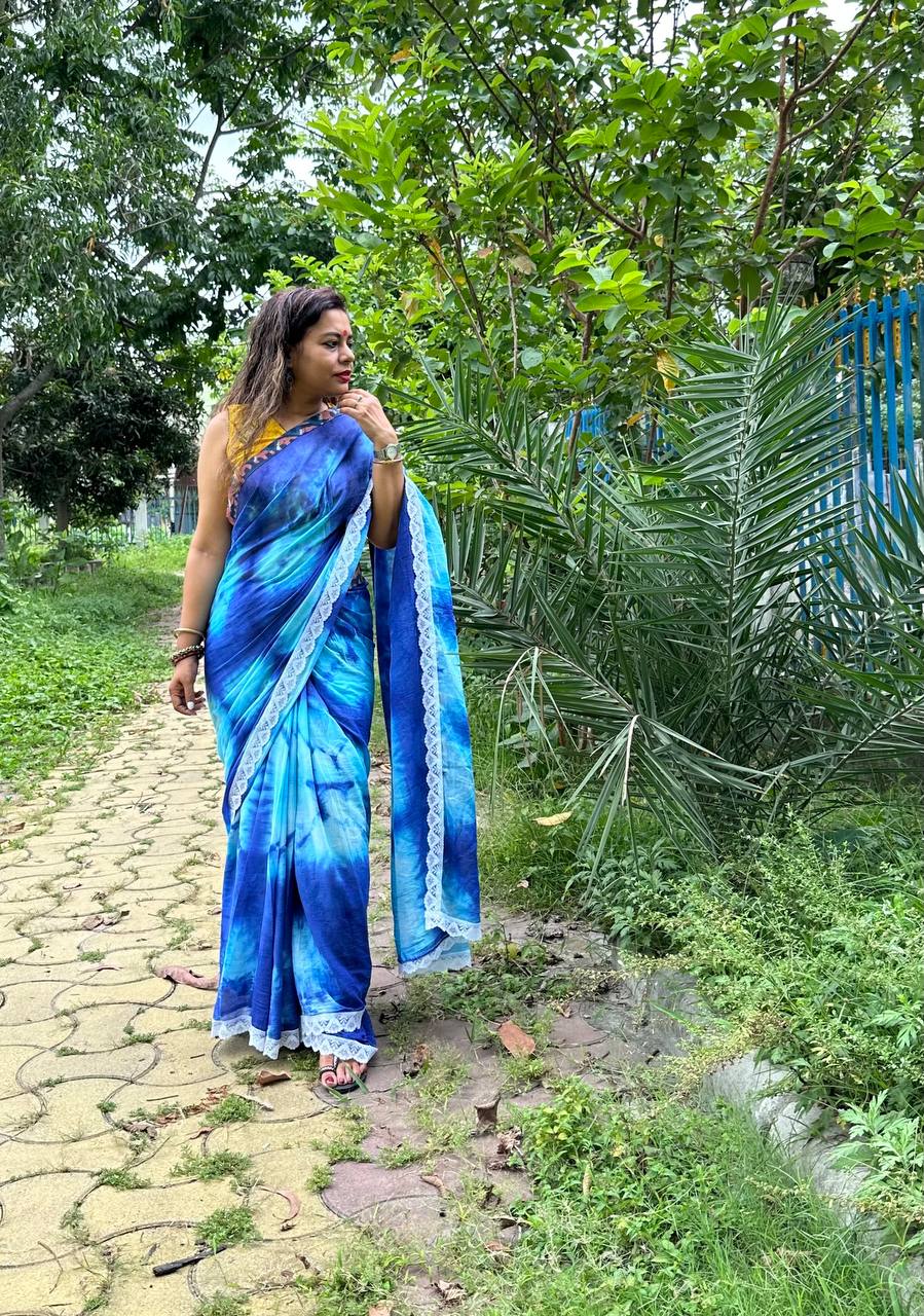 Tye-n-Dye Mulmul Saree with Lace Border in indigo colour.